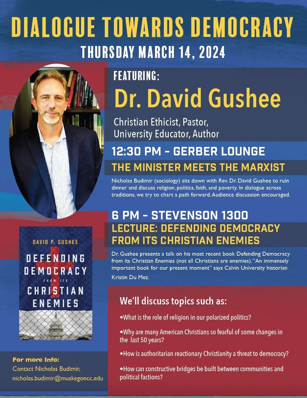 Dr. Gushee a Christian Ethicist, Pastor, Univesity Educator, and Author delivers a public talk on his latest work Defending Democracy from its Christian Enemies (Eerdmans 2023). A penetrating analysis of the phenomenon of authoritarian reactionary Christianity. Questions and discussion to follow with Muskegon Community College Professor Nicholas Budimir.